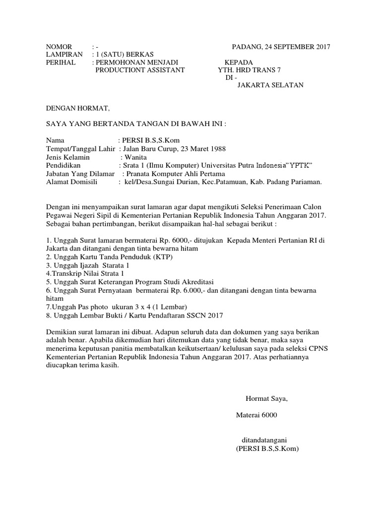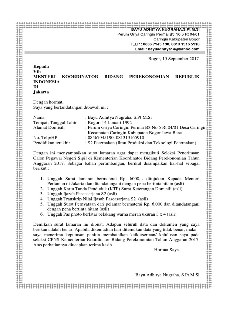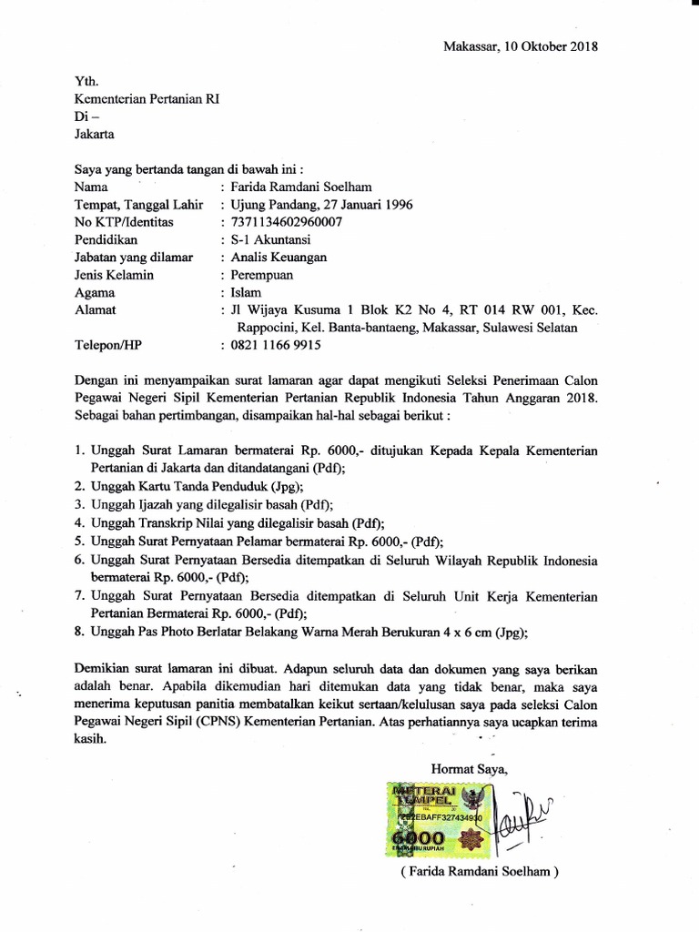 Contoh Surat Lamaran Cpns 2017 Kementerian Pertanian Sfwer from asderweqw.files.wordpress.com Bagi anda yang ingin mendaftar cpns, pastikan hanya mengakses portal resmi pemerintah, yaitu. Referensi tentang bagaiman cara membuat surat lamaran cpns, berikut ini kami sediakan contoh surat lamaran cpns untuk lulusan sma di salah satu kementerian yang. Surat lamaran kepada kementerian pendidikan dan kebudayaan. Format surat lamaran penjaga tahanan, surat pernyataan cpns penjaga tahanan, kementerian hukum dan ham merupakan instansi yang membuka pengadaan calon pegawai negeri sipil tahun anggaran 2018 mencapai. Ada banyak formasi yang dibuka dan tentunya menjadi peluang besar bagi anda yang ingin melamar kerja sebagai cpns. Adapun persyaratan membuat surat lamaran cpns diatas adalah dengan tulisan tangan. Sebenarnya contoh surat lamaran kerja cpns 2018 kementerian agama ini sudah dilampirkan dalam pengumuman pelaksanaan seleksi calon pegawai negeri sipil kementerian agama republik indonesia tahun anggaran 2018. Hari ditemukan data yang tidak benar, maka saya menerima keputusan panitia membatalkan keikutsertaan/kelulusan saya pada seleksi cpns kementerian.